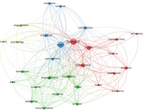 The first cluster (coloured red) includes burnout, characteristics, dissonance, emotion, employees, frontline, hotels, intelligence, personality, and Turkey. On the basis of the obtained cluster, the factors affecting the burnout syndrome among hotel employees can be singled out. The “Characteristics” factor implies job performance, including high-performance work systems, as well as essential personality traits. The “Dissonance” factor includes emotional dissonance. The “Emotion” factor includes to the greatest extent emotional labour, followed by emotional intelligence and dissonance, as well as emotional exhaustion and effort. The “Employees” factor includes factors arising from hotel staff, primarily frontline employees, but also employee well-being, reactions, attitudes, and commitment, as well as the role of domestic migrant workers. The “Frontline” factor emphasizes the role of hotel frontline staff and can be considered as part of the “Employees” factor. The “Intelligence” factor primarily includes emotional intelligence, but also artificial intelligence. The “Personality” factor includes the personality characteristics of employees.