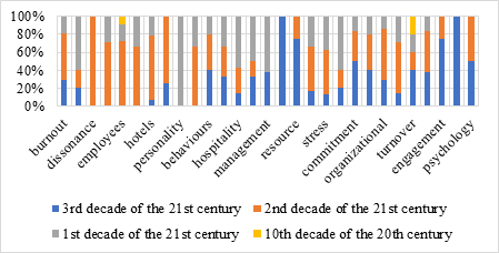 During the last decade of the 20th century, of the defined factors, only “Employees” and “Turnover (intention)” were present. During the first decade of the 21st century, the factors “Dissonance”, “Intelligence”, “Place”, “Resource”, “Engagement”, “Norms”, and “Psychology” were not present. During the second decade of the 21st century, the factors “Personality”, “Management”, “Place”, and “Norms” were not present. During the current part of the third decade of the 21st century, the factors “Dissonance”, “Emotion”, “Employees”, “Frontline”, “Personality”, and “Turkey” were not present. During the first decade of the 21st century, all the papers on personality, most of the papers on management, characteristics, and hospitality, and half of the papers on leadership were published. During the second decade of the 21st century, all papers on the topic of dissonance, most of the papers on the topic of intelligence, employees, emotion, hotels, frontline, Turkey, organizational, satisfaction and burnout, as well as half of the papers on services, stress and psychology were published. During the analyzed part of the third decade of the 21st century, all papers on the subject of place and norms, most of the papers on the subject of resources and engagement, as well as half of the papers on commitment and psychology were published. The topics of behaviours and intentions were mostly analyzed in the second and third decades of the 21st century, customer in the first three decades of the 21st century, and turnover in the third decade of the 21st century, while work was mostly analyzed in the second decade of the 21st century.