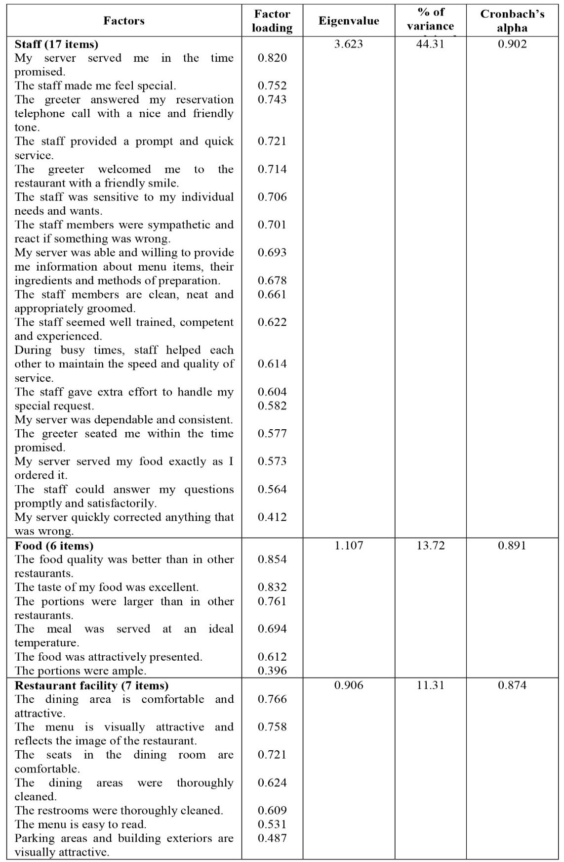 According to the factor analysis of 30 items (Table 3), the first dimension was formed by 17 items. The name of the first component can be derived by analyzing the content of these items, especially those with the highest factor weights. They are dominated by the statements relating to the employees’ behavior, appearance and treatment. Therefore, the first component on which the restaurant service quality depends can be called Staff. The second dimension was formed by 6 items, the contents of which unambiguously indicate food and meals characteristics. Based on this, the second dimension is named as Food. The third dimension was formed by 7 items from the content of which logically derives the name of the third component Restaurant facility. Similar to that, Miksen (2019) concluded that food, staff and environment, together with customer service and costs have huge importance for a restaurant’s success. Although Kim et al. (2009) used almost the same instrument for measuring service quality of restaurants, they found four dimensions: Product/Service, Reliability, Greeter and Physical Environment.
