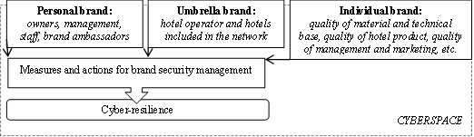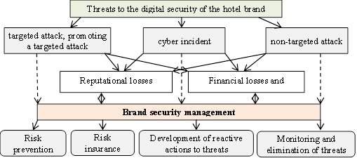 Brand forming is an imperative for the successful operation and development of a business, which often becomes a working intangible asset and brings additional income, providing the commitment of consumers. Maintaining a positive brand reputation is a difficult task in today’s environment, particularly in cyberspace. After all, the main communications in the conditions of the pandemic lockdown and the war in Ukraine today have moved to the Internet environment (Prokopyuk & Chernysh, 2023). This situation provoked waves of cyber-attacks and cyber incidents (Upadhyay & Rathee, 2022). Therefore, to be an asset, brand communication platforms must become secure. In Ukraine, hotel chains are represented by both national and international brands that survived the difficult times of quarantine, and today are under the influence of constant physical threats of destruction and information wars as a result of Russia’s military aggression. This led to the cessation of tourist flows – sources of loading the room stock. Therefore, the relevant task in the current perspective is to work on strengthening and developing the brand, managing databases with customer-oriented remote service, as well as protecting the brand from various threats that cause reputational and financial losses.