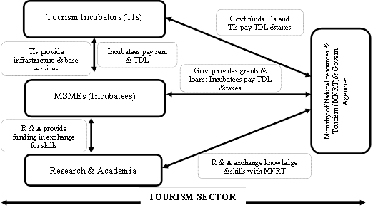 Accordingly, incubators around the world are usually attached to research and academia or public entity or to a community-based development entity to allow government or private sector to provide initial financial resources into incubation initiatives. A key aspect of this theoretical framework is that it conceptualizes resources (revenue and skills) between key players in the tourism sector. It is important to note that tourism business incubators are considered moderators of these two key resources. Given that, the effectiveness and efficiency of any tourism business incubation are directly related to the tourism development levies and taxes that the government provides to support MSMEs in Tanzania.